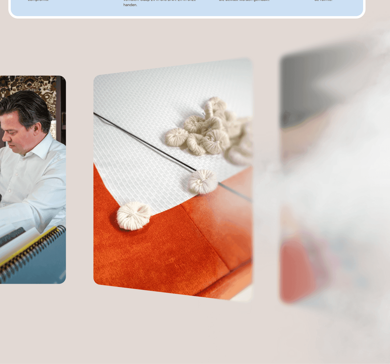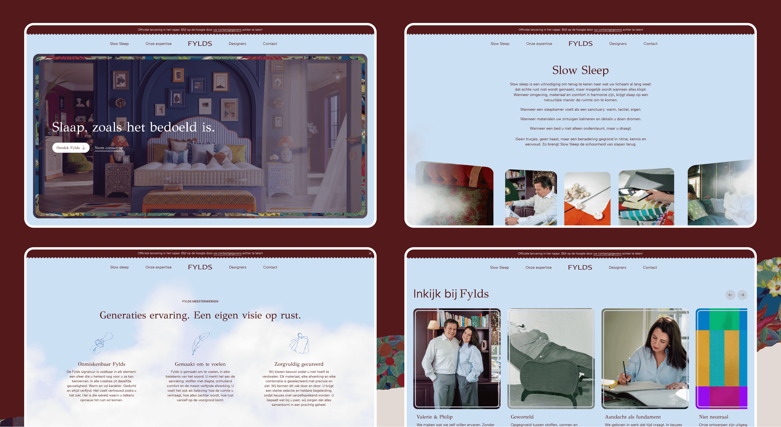 The site is structured around the three things FYLDS offers: a curated bed collection, a bespoke service for custom pieces, and a selection of handpicked bedroom details. Each of these gets its own dedicated space, giving visitors a clear picture of what the brand stands for. We also dedicated a section to featured designer Marylène Madou, whose handcrafted textile prints are a key part of the brand's visual story.